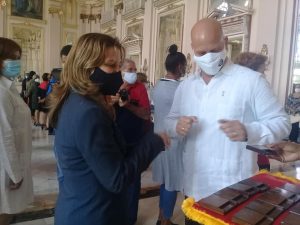 Recibe Rosabel Gamón Verde, Viceministra Primera de Justicia, de las manos de Gerardo Hernández Nordelo Héroe de la República de Cuba Sello Conmemorativo “Aniversario 60 de la FMC” que se entrega por única vez. Un reconocimiento a la consagración y el valor humano. ¨Felicidades¨
